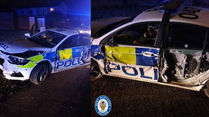 Mężczyzna 7 razy uderzył Fordem Transitem w policyjny radiowóz.