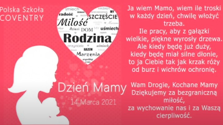 Życzenia z okazji dla Mamy nagrane przez Uczniów Polskiej Szkoły w Coventry oraz scholi dziecięcej "Do-Re-Mi fasolki" przy parafii p.w. Św. Stanisława Kostki w Coventry.