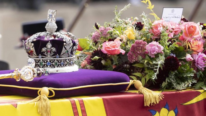 Symbole władzy monarszej Elżbiety II - imperialna korona, berło i jabłko królewskie - zostały pod koniec nabożeństwa pogrzebowego zdjęte z trumny z jej ciałem i przekazane dziekanowi kaplicy św. Jerzego w Windsorze, który położył je na ołtarzu.