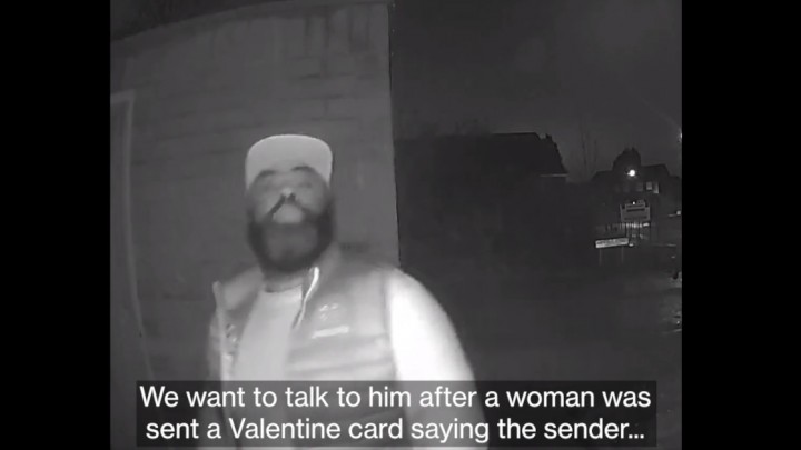 Opublikowane zostało nagranie, na którym widać jak poszukiwany skrada się by wrzucić kartkę walentynkową przez drzwi.